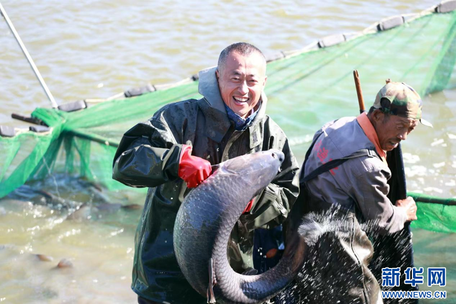 养殖户在渔场里捕捞淡水鱼。新华网发