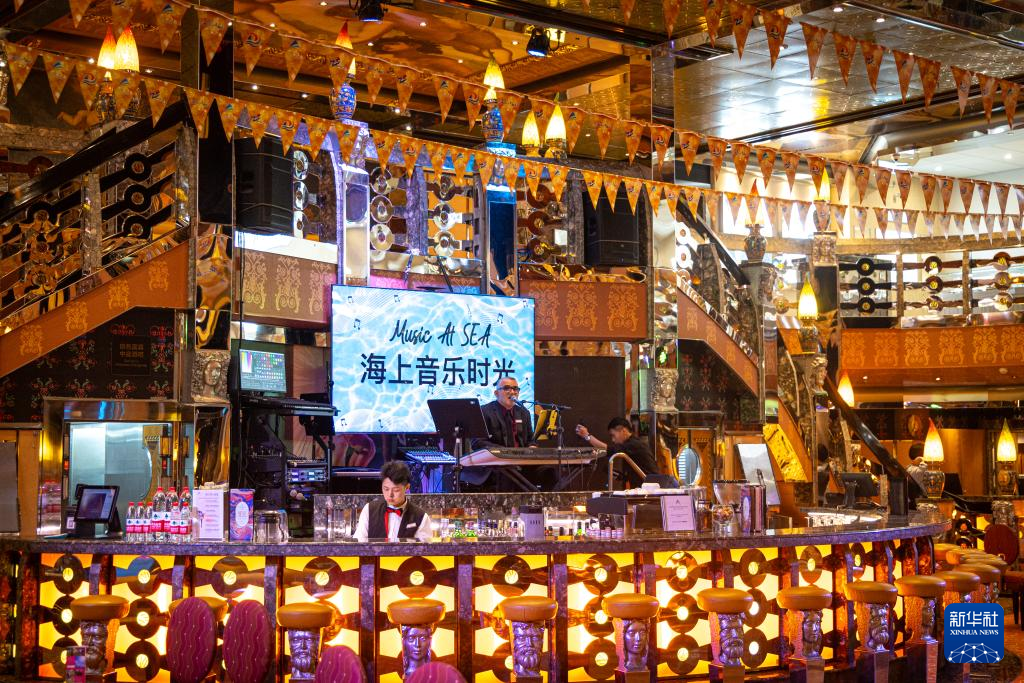 5月27日,在国际邮轮“爱达·地中海”号上,工作人员为游客演出。