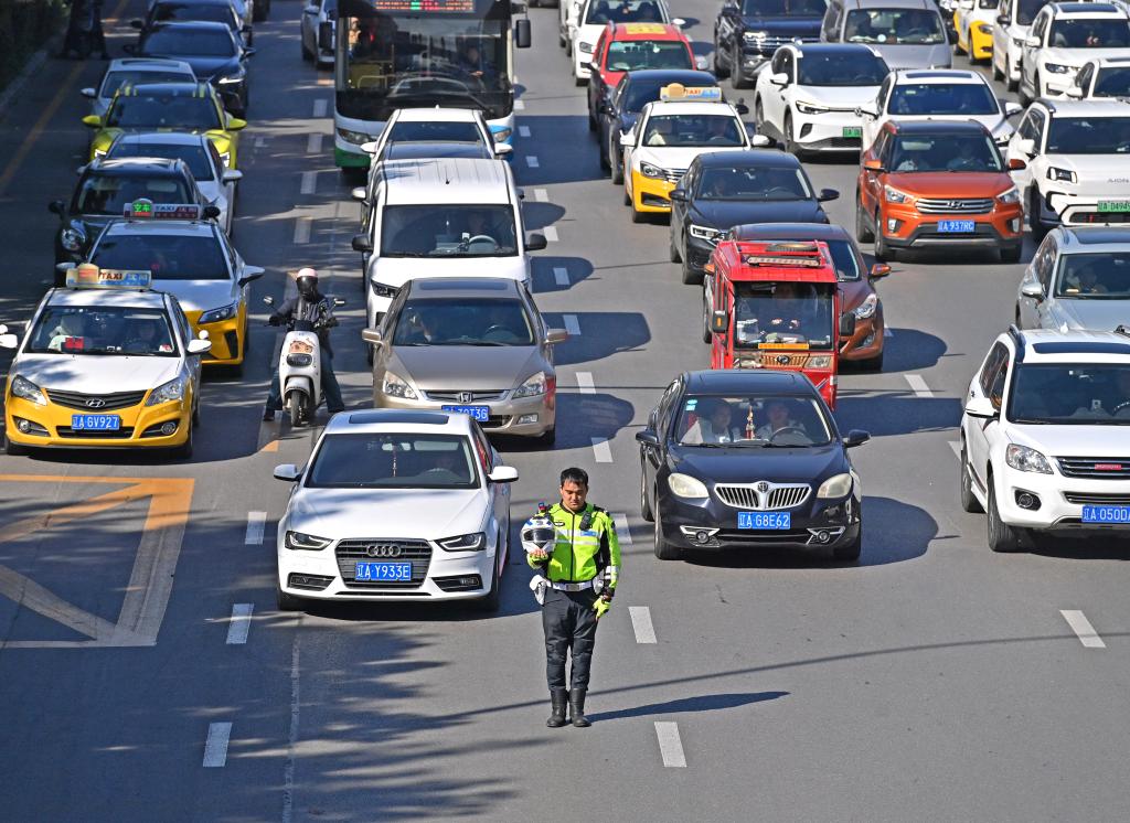 9月18日,交警在沈阳崇山中路脱帽伫立。新华社记者 周华 摄