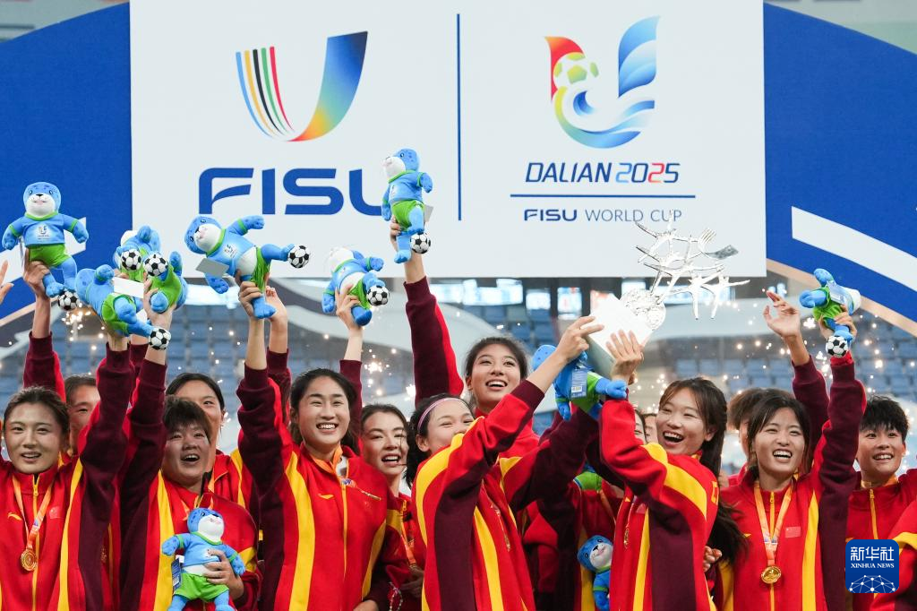 9月27日,冠军上海体育大学女足在颁奖仪式上。新华社记者 郑焕松 摄