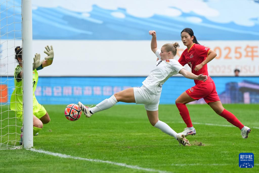 9月27日,上海体育大学女足球员尹丽红(左二)在比赛中射门得分。新华社记者 郑焕松 摄
