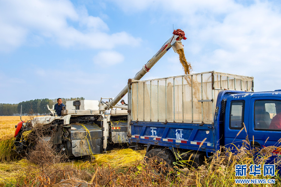 图为农户在辽宁省沈阳市辽中区杨士岗镇前邢村一处稻田收割水稻。新华网发