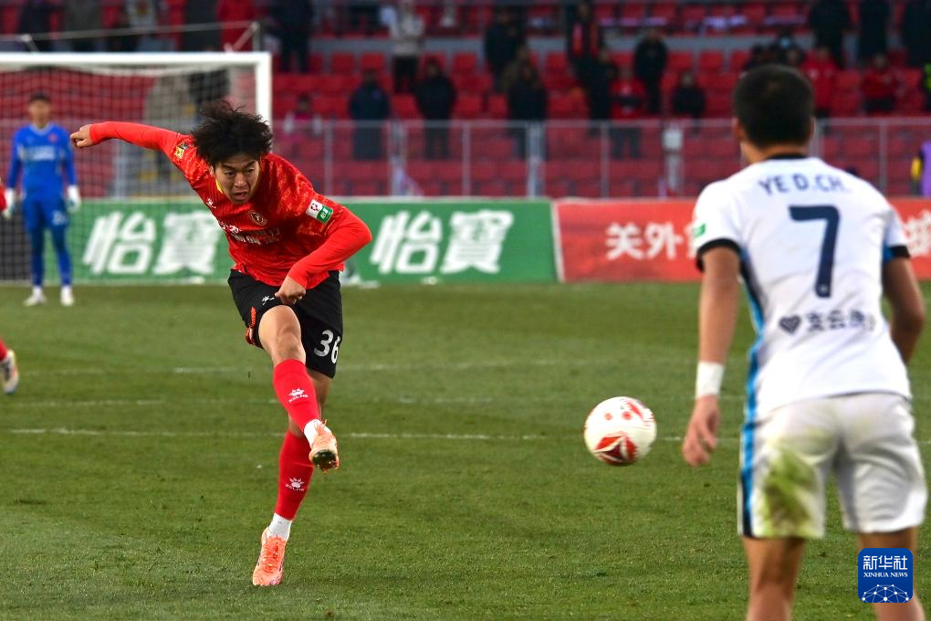 10月26日,辽宁铁人队球员田德澳(左)在比赛中射门。新华社记者 吴青昊 摄