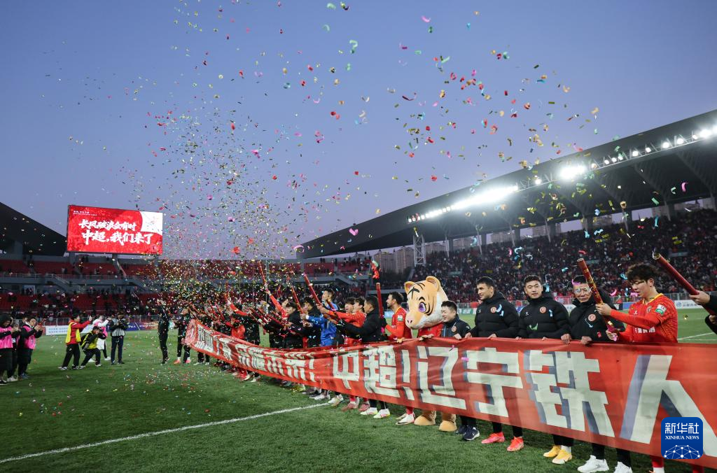 10月26日,辽宁铁人队在赛后庆祝。当日,在辽宁沈阳举行的2025赛季中国足球协会甲级联赛第28轮比赛中,辽宁铁人队1比0战胜南通支云队,提前锁定中甲联赛冠军,并实现冲超目标。新华社记者 李钢 摄