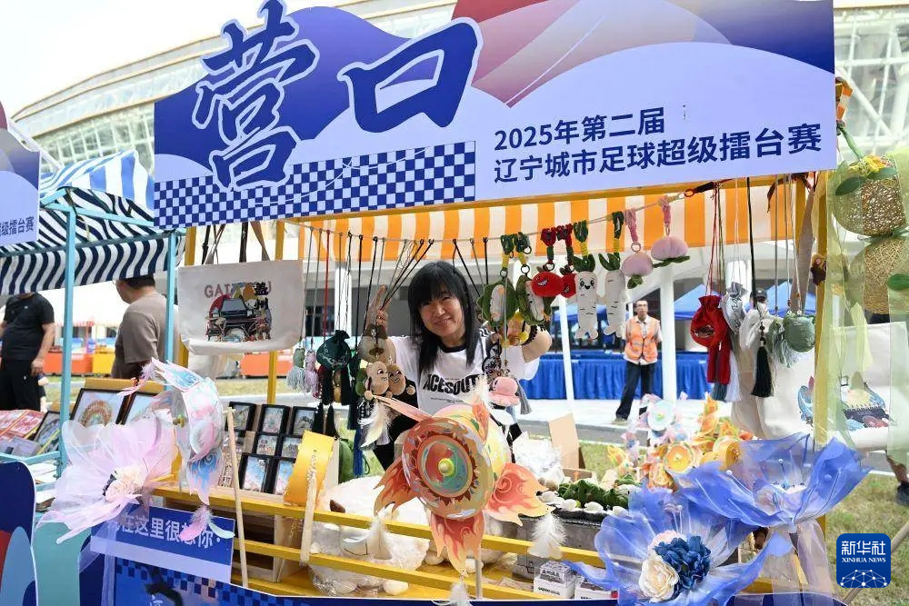 “辽超”场地旁,“辽超市集”营口摊位售卖文创等产品