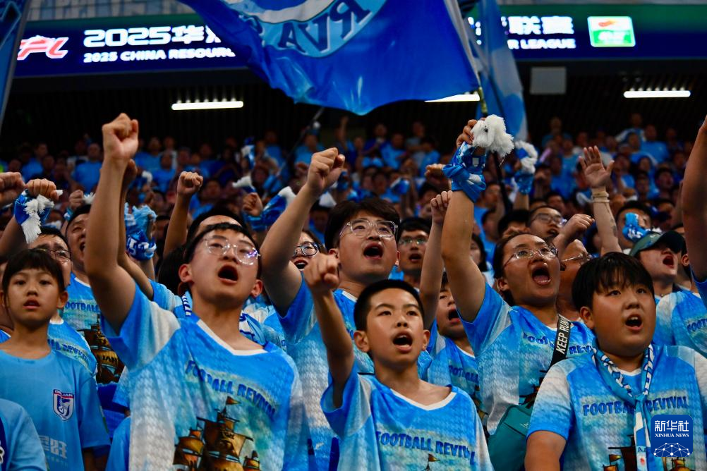 8月3日,大连英博队球迷在加油助威。当日,在辽宁大连举行的2025赛季中国足球协会超级联赛第19轮比赛中,大连英博队2比0胜青岛海牛队。新华社记者 吴青昊 摄